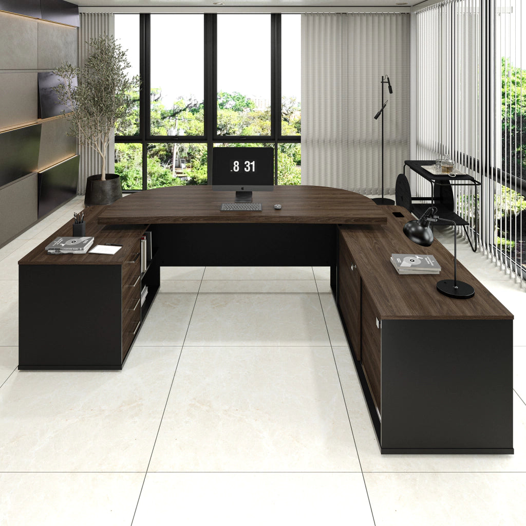 Seu escritório totalmente sofisticado e funcional, com esta encantadora mesa em “U”! Realmente grande e espaçosa, ela é muito imponente e vai impressionar a todos com seu design moderno e autêntico, garantido pelas belas curvas e somado ao tampo sobreposto e muito robusto de Tamburato de 50mm de espessura!