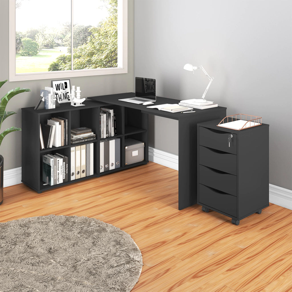 Fabricado com material ecologicamente correto, possui 08 nichos para facilitar a organização do seu dia a dia. Seu amplo espaço permitirá que você guarde papéis e outros materiais em um só lugar. Além de possuir um visual moderno e prático, a mesa de trabalho pode ser montada para o lado direito ou esquerdo, adaptando-se ao seu espaço. O gaveteiro já vem com chave, para que você possa guardar suas coisas com segurança e conveniência. possui rodízios para um transporte mais prático e fácil, além de, dessa forma, manter o chão sem riscos.