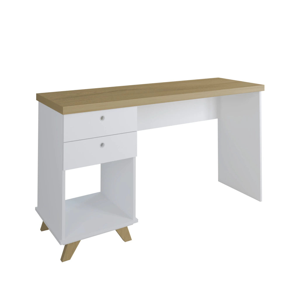 Escrivaninha de 1,35 com gavetas 5934 Trabalhe e estude de maneira organizada e produtiva com esta linda escrivaninha perfeita para você transformar o ambiente em um local agradável e charmoso. Seu belo design retrô é proporcionado pelos pés angulados detalhe que faz toda a diferença na aparência final. É muito versátil e se adapta ao seu estilo podendo ser usada em home office para estudo e também em escritórios mais formais. O nicho e as gavetas são ideais para manter o local organizado já que guardam todos os seus objetos livros e materiais com muita elegância. O amplo tampo garante muito conforto e comodidade para você trabalhar ou estudar com espaço para seu computador notebook papéis livros e cadernos. Materiais e o revestimento de alta qualidade proporcionam a beleza e alta qualidade que sua casa merece!