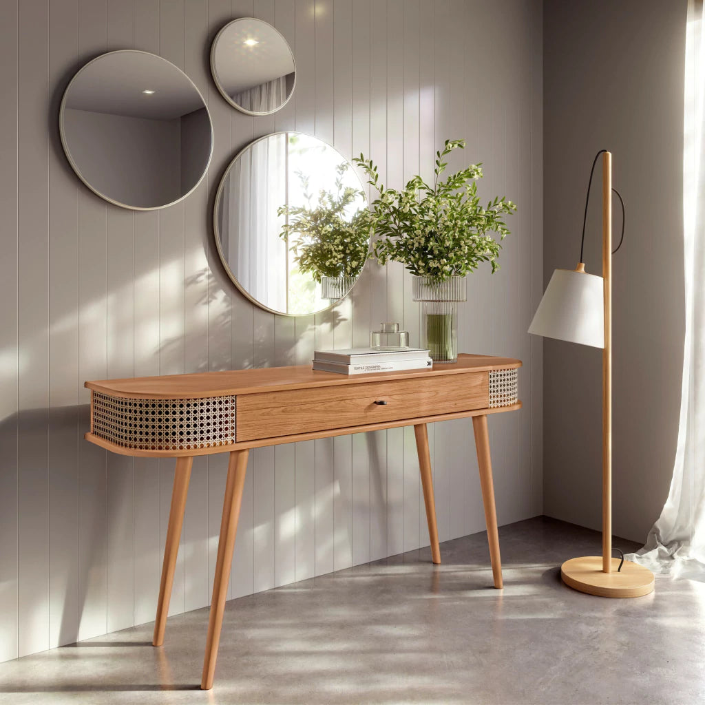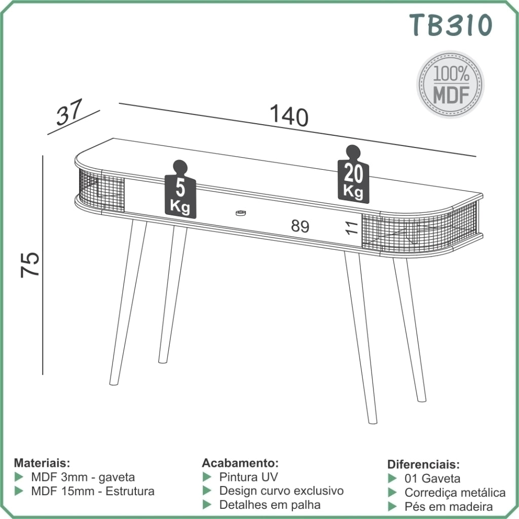 Com Pés em estilo Retrô, Tampo Curvo com suporte para 20 Kg, 1 Gaveta com Puxador e Detalhes em Tela de Palha Sintética, esse Aparador é a peça perfeita para compor a sua Decoração! Ideal para complementar sua Sala ou Hall de entrada, dando um toque mais Charmoso ao ambiente, o móvel pode ser usado para acomodar Livros, Vasos, Fotografias e demais itens, tudo de acordo com a sua necessidade! Sua estrutura é feita em MDF com acabamento em Pintura UV.